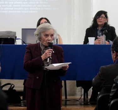 Mientras se proyectaban obras de arte de una de las exposiciones curadas por Ashraf Fayadh, la escritora y periodista Elena Poniatowska realizó su intervención.