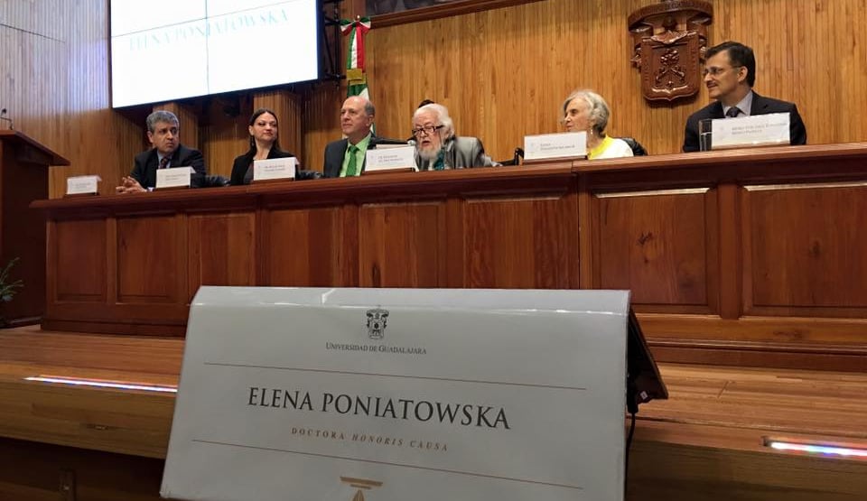 Elena Poniatowska fue distinguida con el título de "Doctora Honoris Causa" por parte de la Universidad de Guadalajara (UdeG) por sus aportaciones al periodismo y la literatura universal, ya que mediante su crítica México se ha vuelto un país más democrático. “Elena Poniatowska en cada reportaje, en cada libro, en cada entrevista, en cada testimonio recoge, se empapa con intensidad del acontecer mexicano. Y cada trabajo de su escritura es un bautizo de fuego porque su honestidad intelectual, su empeño cuidadoso en lograr la mejor expresión la obligan a asumir cada uno de sus proyectos como un nuevo reto, los emprende con la firma esperanza de hacer el mejor trabajo y ese es el que está por escribir”, dijo.